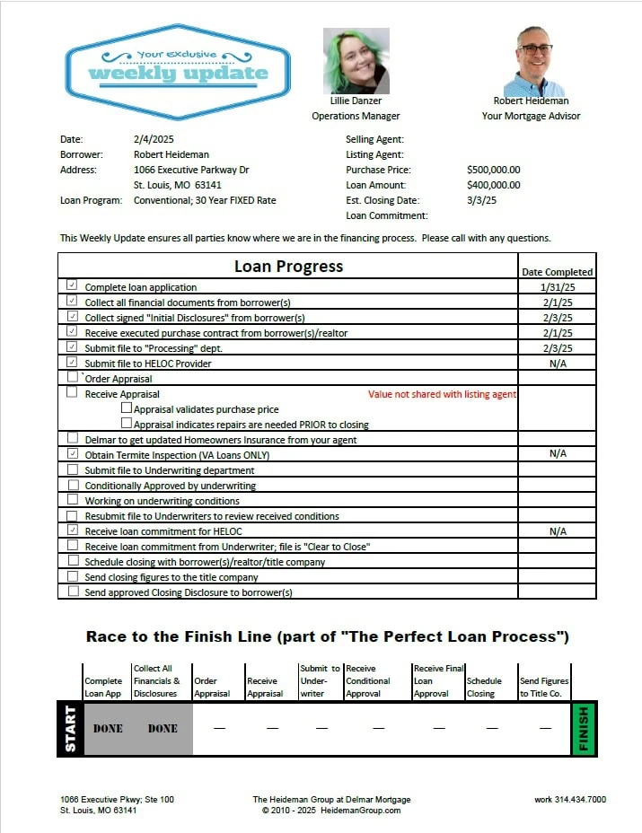 In the ever-evolving mortgage industry, creating a loan can be an overwhelming process for all involved. To ensure that our borrowers and their realtors stay informed, The Heideman Group sends out a Weekly Update every week. This will keep all parties up to date on where we are in the loan process. By keeping everyone informed, we hope to make the process less daunting and more manageable for everyone involved.